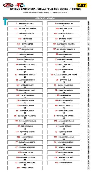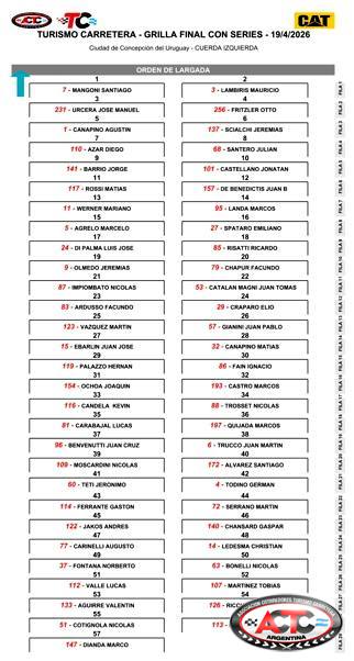 El Gran Premio RUS tiene a Santiago Mangoni y a Mauricio Lambiris en la punta de la grilla para la final del Turismo Carretera en Concepción del Uruguay. El Chevrolet Camaro del de Balcarce ganó la serie más rápida y sale por la cuerda izquierda, y a su derecha estará el Ford Mustang alistado por el Gurí Martínez Competición del uruguayo.